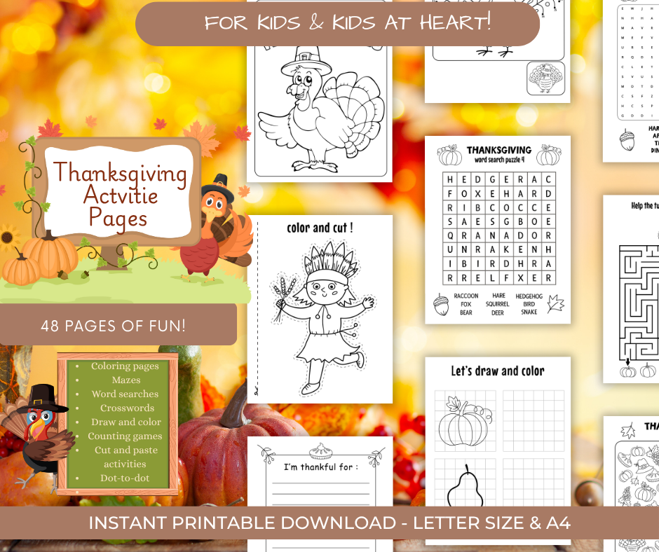 - My Thanksgiving Activity Bundle includes printable games, gratitude prompts, and coloring sheets designed to keep kids entertained while reinforcing the spirit of thankfulness.